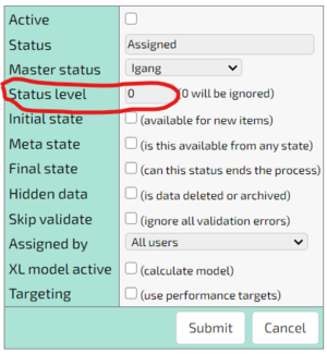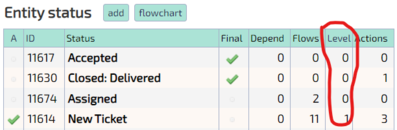 Status levels are numerical categories that one or more statuses can belong to. Individual Fields in an Entity can be configured to depend on these levels such that they can be made inactive and hidden if the Entity record is not in a status with the correct level. For example can the dependency be set for all status levels above a certain value such that one or more Fields are only active and displayed for those levels. To see the status levels of an Entity's statuses, go to that Entity in the back-end and look in the column shown in picture 1.